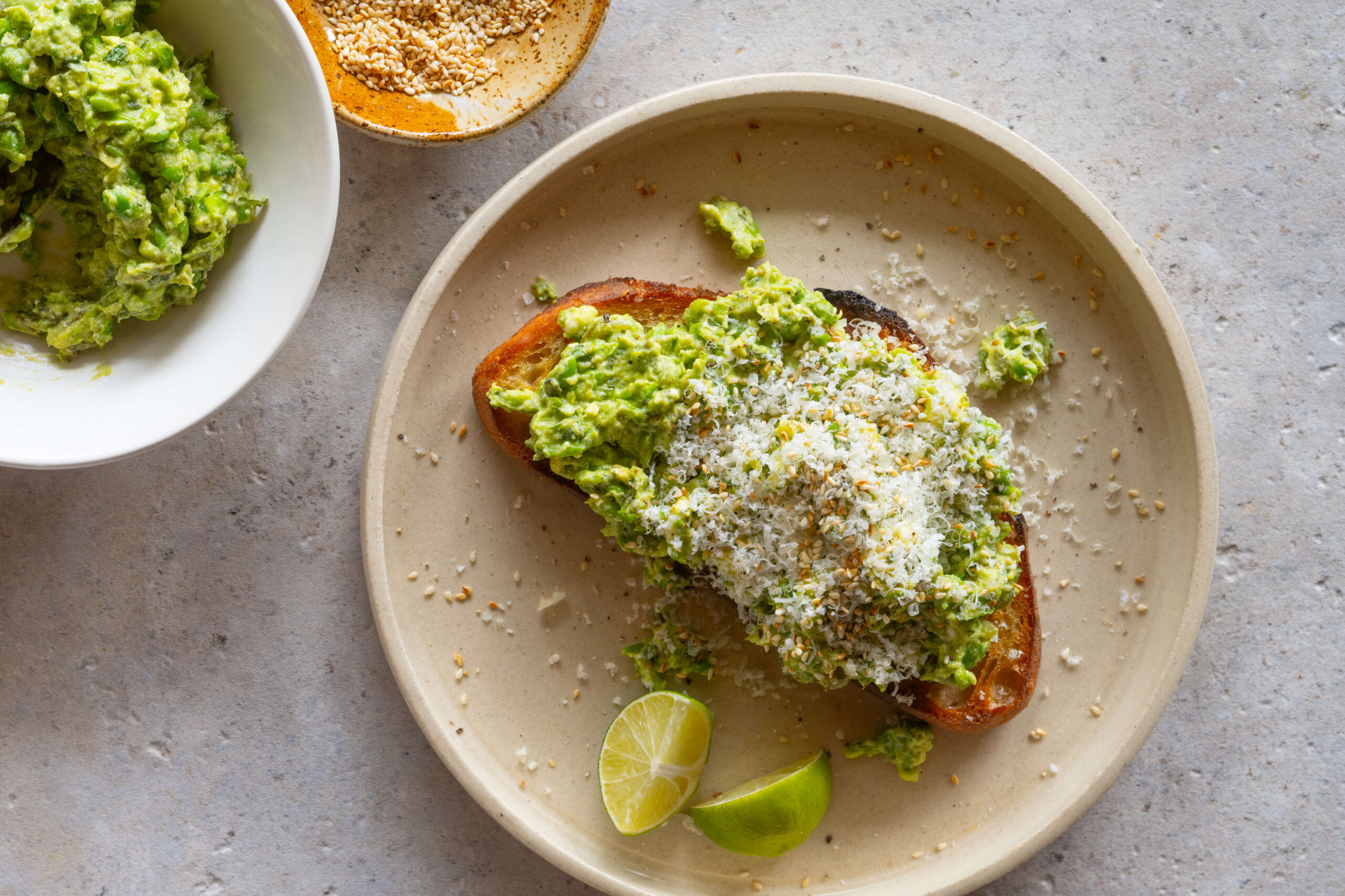 Place heaped spoonfuls of the mash onto the toast and top with parmesan and sesame seeds.