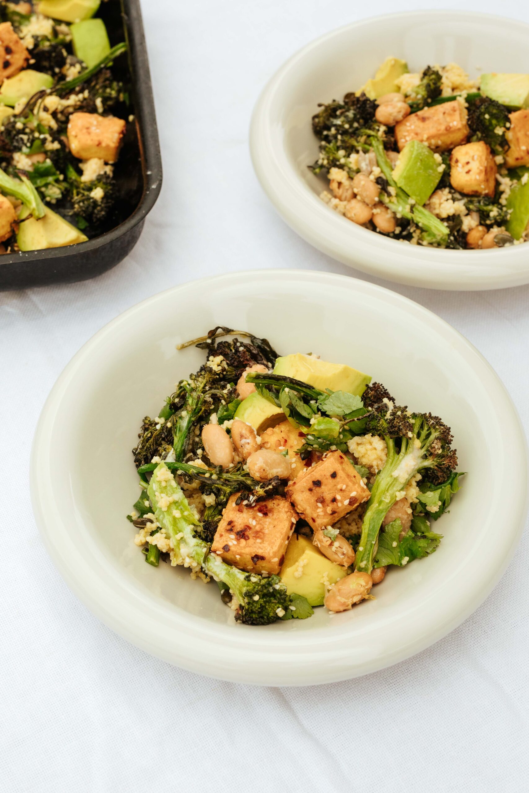 To assemble, add the cooked millet to the tray of roasted broccoli and butter beans and toss to combine. Top with the tofu and drizzle over the creamy lemon tahini. Finish with the avocado chunks, fresh herbs, and pumpkin seeds, and an extra drizzle of chilli oil.